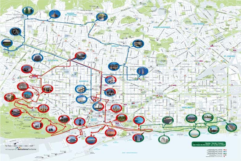 The red route stops at the following tourist attractions and museums: Barcelona Sants railway station, Creu Coberta, CaixaForum – Pavelló Mies van der Rohe, Plaça d’Espanya, Poble Espanyol, Museu Nacional d’Art de Catalunya, Anella Olímpica, Fundació Joan Miró, Montjuïc Cable Car, Miramar, Museu Marítim, World Trade Center, Port Vell, Museu d’Història de Catalunya, Port Olímpic, Bogatell Beach, Parc de la Ciutadella, Barcelona Zoo, Pla de Palau, Gothic Quarter, Plaça de Catalunya, Fundació Antoni Tàpies, La Pedrera and La Diagonal.